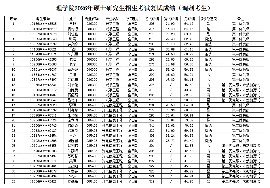 裸聊 2026年硕士研究生招生复试成绩公布第二批(光学工程、光电信息工程)