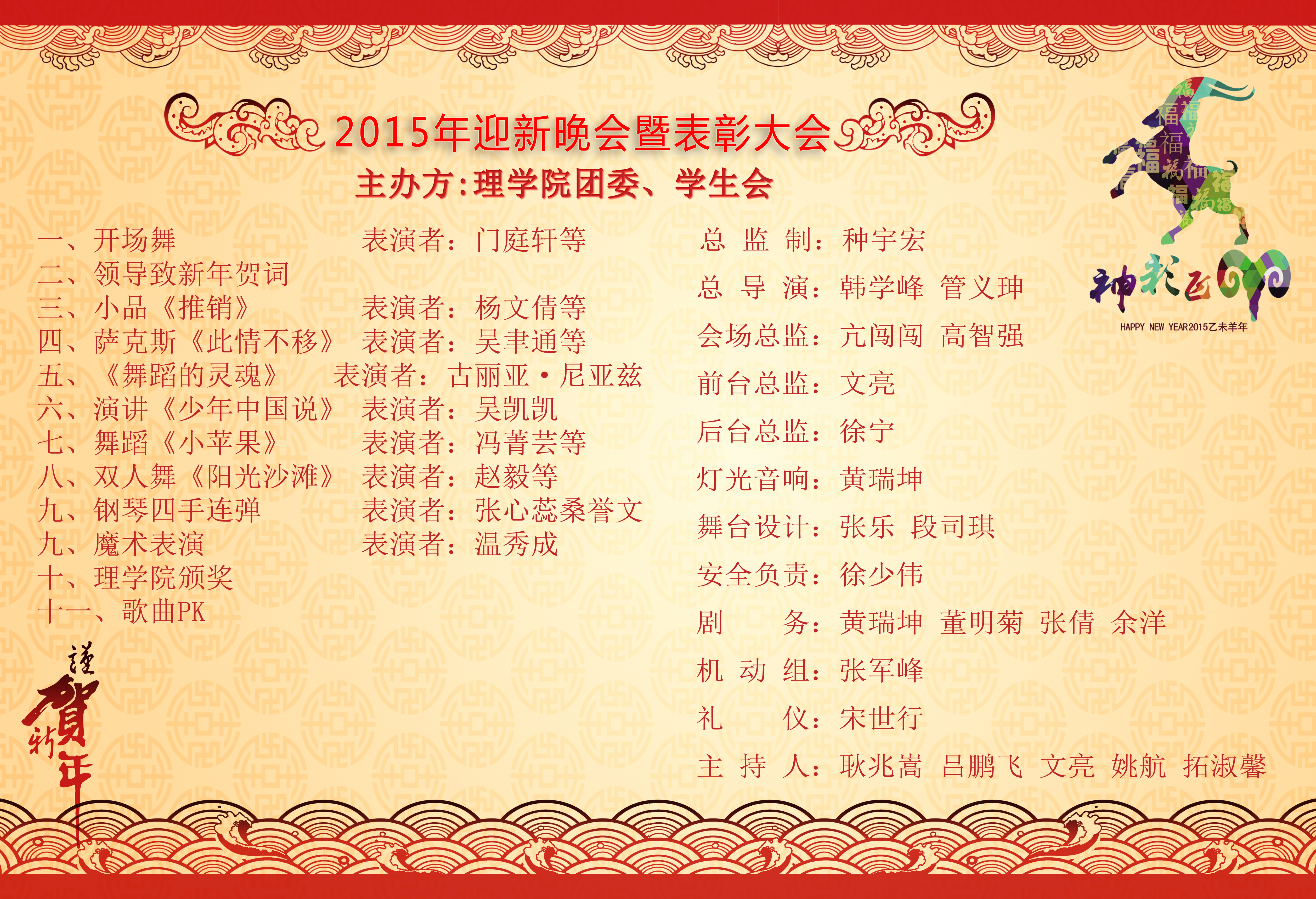 2015年迎新晚会暨表彰 大会成功举行,晚会得到了到场领导的充分认同与肯定,受到了在场同学的喜爱与好评。