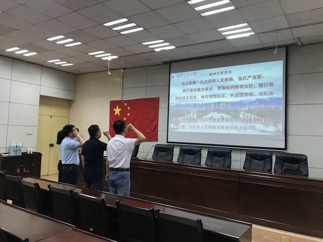 在宣誓仪式前,廖敏书记带领大家一起认真学习了《教育部关于建立健全高校师德建设长效机制的意见》《中共中央、国务院关于全面深化新时代教师队伍建设改革的意见》、《教育部关于高校教师师德失范行为处理指导意见》等重要文件,同时结合我校下发的《裸聊