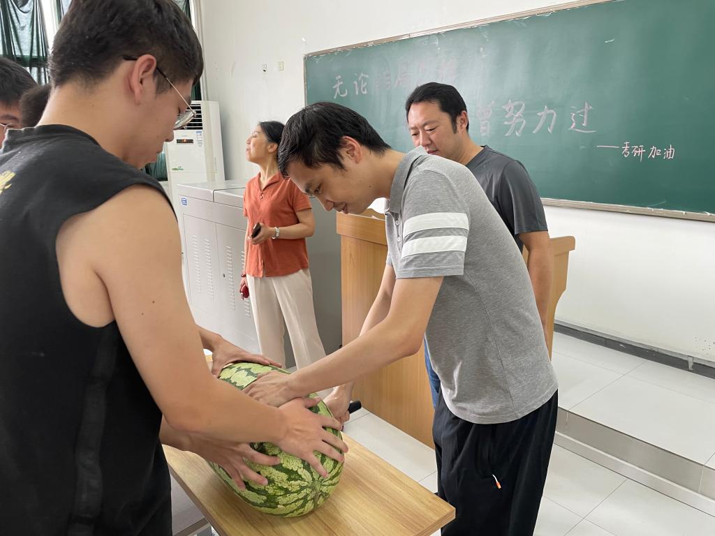 在鄠邑校区,廖书记一行看望慰问了备考研究生考试的七十余名2018级本科学生和十余名参加数学建模竞赛培训的本科生,为同学们送去西瓜解暑。廖书记充分肯定了考研学生的学习精神和决心,表扬了他们不畏酷暑、坚持学习的坚毅品质,她鼓励同学们以踏实、积极和高效的良好状态充分利用好研究生考试前的最后一个假期。马小刚副书记叮嘱大家,留校期间提高安全意识,遵守校规校纪,在学习生活中遇到困难及时与辅导员联系。学院领导还询问了学生在校遇到的学习和生活中的困难,希望同学们劳逸结合,增强安全意识,注意寝室、饮食、交通等安全。