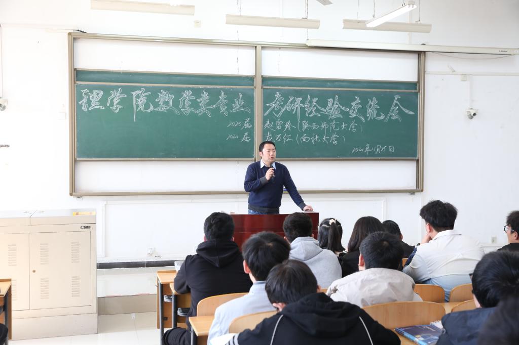 数学类专业考研经验交流会”,2019级和2020级全体数学类专业本科生参会。赵雪玲校友从我校信息与计算科学、数学与应用数学的专业课学习入手,建议所有同学一定要尽早通过英语四、六级,扎实学好《数学分析》《高等代数》《概率论与数理统计》《常微分方程》等几门课程,为今后的考研打下坚实的基础;龙万江校友回忆了自己大二、大三时的学习状态,就英语学习、开拓专业视野、综合素质提升等三个方面给所有同学做了经验交流。学院党委副书记马小刚结合数学类近三年考研就业现状,要求全体数学类专业同学踏实学习、刻苦努力,为今后的考研就业打下坚实基础。针对个别数学类专业近两年在就业中出现的困难和问题,马老师鼓励所有同学提前思考、提前准备,做好全员考研的知识积累和储备工作。
