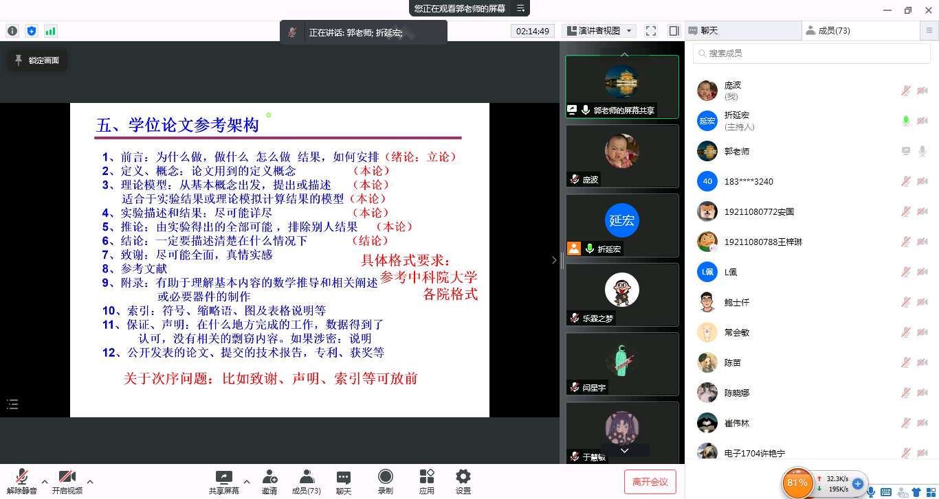 报告开始,郭教授从疫情形势出发,谈及当前学习科研和论文撰写存在的不便和困难,针对性地提出解决办法和意见建议。接着,郭教授重点针对研究生学位论文撰写过程中常见的问题和难题,从论文目的、构思方法、写作模式、体现方式等不同侧面,以要点概括与论文实例相结合的形式,兼论正文格式文体要诀,从“研究生与学术研究”、“需牢记的事情”、“学位论文的要求和特点”、“写学位论文的步骤”、“参考结构”等7个方面详细全面地讲述了如何写出一篇优秀的学术论文。最后,郭教授与同学们进行了交流互动,在线解答了学生们的各类疑惑和问题。同学们兴致盎然、反响热烈。