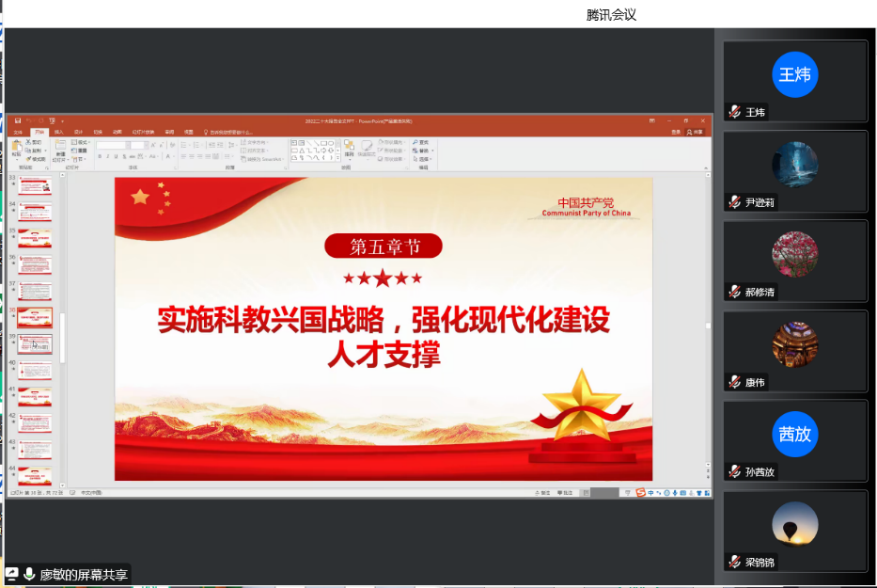 院党委书记廖敏首先带领全院教职工学习了习近平总书记代表第十九届中央委员会所作的题为《高举中国特色社会主义伟大旗帜 为全面建设社会主义现代化国家而团结奋斗》的报告。廖敏书记对报告的总体框架和习近平总书记在党的二十大报告中提出的一系列新观点、新论断、新思想、新战略、新要求进行了初步的解读。她要求全体教师要聚焦立德树人根本任务,真正学深悟透。在当前面临的疫情防控特殊时期,更要通过学习,践行党的二十大精神,立足岗位扎实做好自身工作,踔厉奋斗、勇毅前行,展现教师应有的责任和担当,引导学生深刻领悟“两个确立”的决定性意义,增强“四个意识”,坚定“四个自信”,做到“两个维护”,使学生将爱国情、强国志、报国行统一到实现中华民族伟大复兴的历史征程中,努力把学生培养成有理想、敢担当、能吃苦、肯奋斗的新时代好青年。