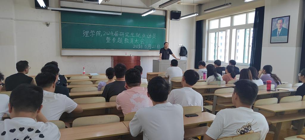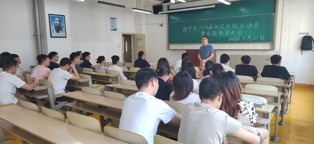 2023届研究生就业情况:截至六月中旬,学院研究生就业率达到100%。他详细分析了2023届研究生的就业特点、就业质量,分享两位研究生同学成功考博的经历,为2024届研究生的就业、考博提供建议和参考。展望学院2024届研究生就业工作,折延宏副院长分三个方面作就业动员。一是希望研究生同学早思考、早准备,将就业与考博作为下一阶段最重要工作;二是希望研究生同学立足所学专业,将目光放长远,到基层去、到祖国需要的地方建功立业;三是希望研究生同学关注本年度暑期社会实践、企业就业实习,为成功求职打下坚实基础。最后,折老师结合暑假实验室安全、“端午”小长假,为大家作了安全教育和提示。