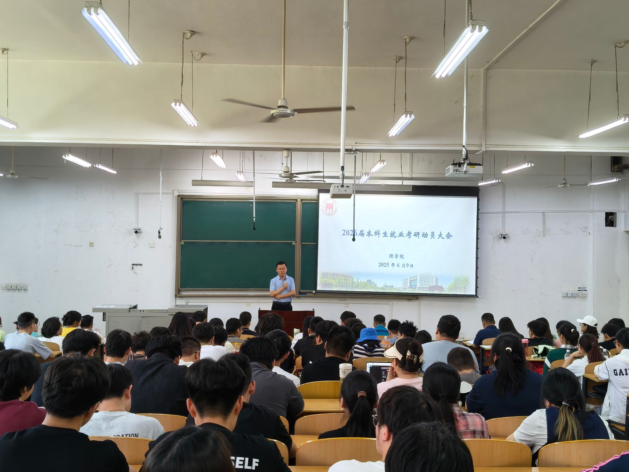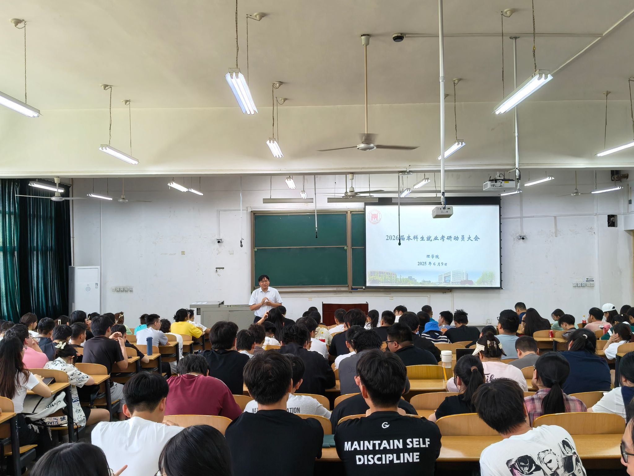 在鄠邑校区博思楼B125教室召开2026届毕业生就业考研动员大会。学院院长折延宏,党委副书记杨富民出席大会,应用物理系副主任丁继军、应用数学系副主任马儇龙以及2026届全体本科毕业生参加大会。会议由学生工作办公室副主任庞波主持。