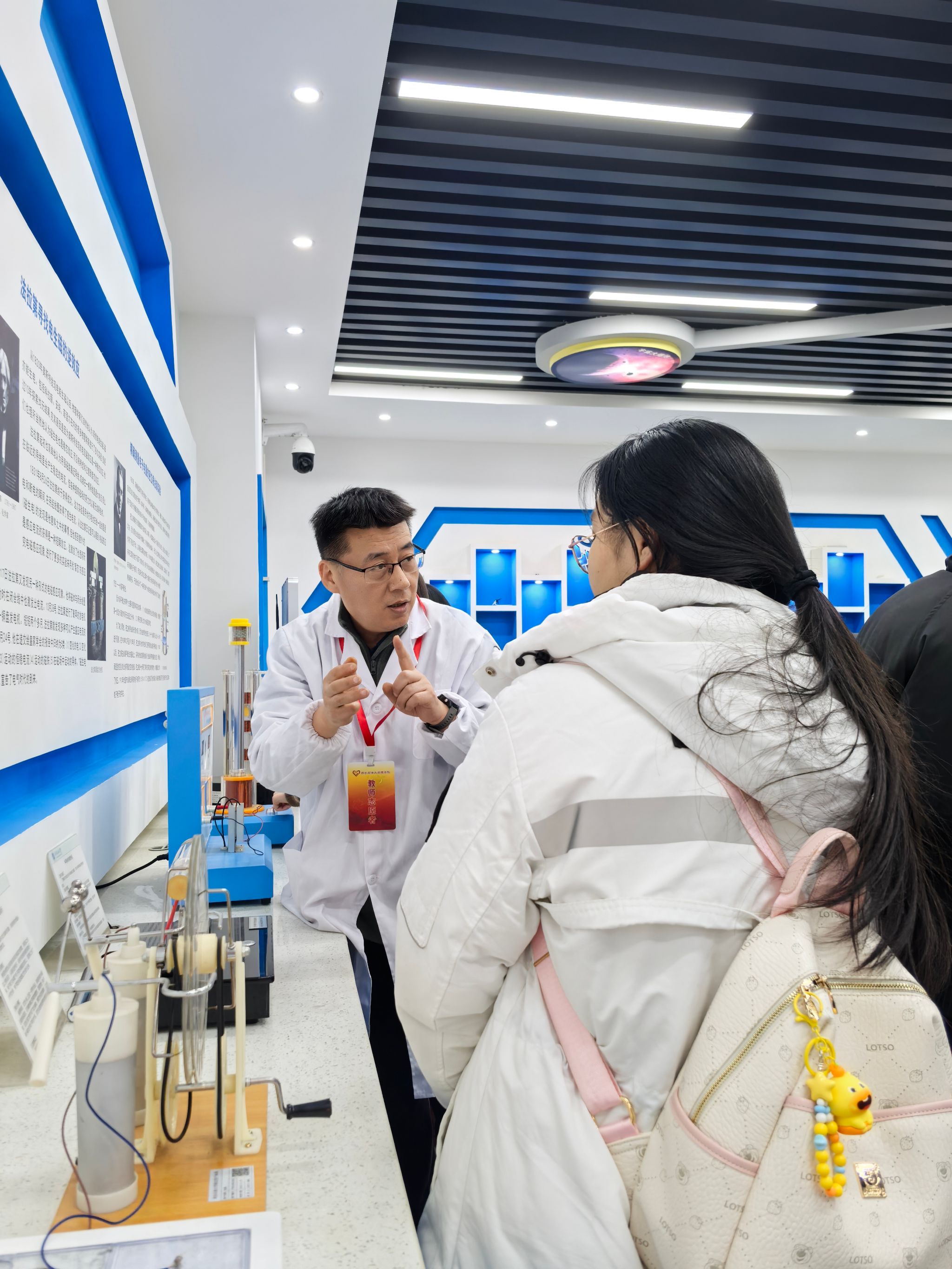 师生讲解员的耐心讲解和示范下,同学们依次参观并亲身体验了一系列精彩的物理实验。从灵巧的机械装置,到神奇的电磁感应;从热现象的微观奥秘,到光和影的奇幻世界,每一个实验都让同学们惊叹不已,深深感受到了物理世界的无穷魅力。这些精心设计的演示实验,不仅激发了学生对物理学奥秘的好奇心与探索欲,更为大家搭建起了一座通往科学殿堂的桥梁,让物理之美跃然眼前,深入人心。