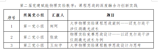 最后,开展了“第二届党建赋能物理实验教学:课程思政的深度融合与创新实践”特色主题党日活动,三个党小组在前期精心准备的基础上进行了逐一汇报交流。汇报完毕,党员教师围绕支部建设、课程思政、党建引领等内容展开了深入交流讨论。