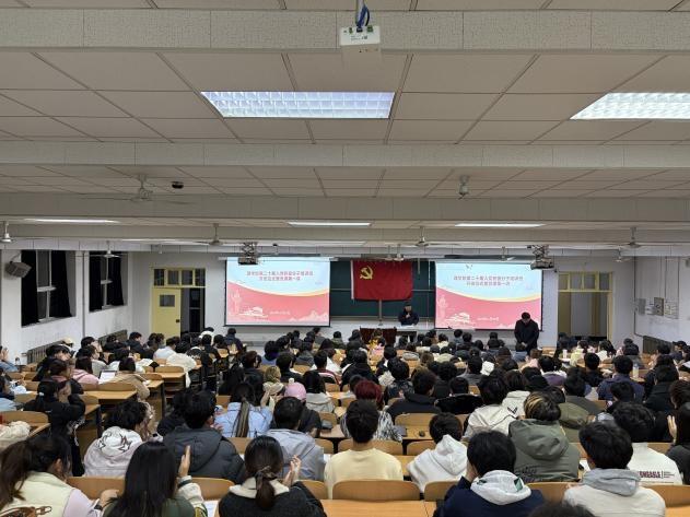开班仪式后,学生工作部(处)部(处)长王亮作了开班第一讲。他以《以中国式现代化推动中华民族伟大复兴》为主题,以“新思想的核心要义与实践要求”为切入点,紧密结合党的二十大精神与我校专业特色,从“中国式现代化是实现中华民族伟大复兴的光明大道”、“中国式现代化的中国特色”、“中国式现代化的本质要求”、“推进中国式现代化的重大原则”四个维度展开讲解。他以通俗化表达拆解理论要点,重点列举我国航天工程、量子通信等领域的科研突破,生动阐释了青年党员在科技创新中的使命担当,鼓励同学们将数学、物理等专业所学与国家战略需求相结合,在实验室攻关、志愿服务、社会实践等场景中践行初心使命。