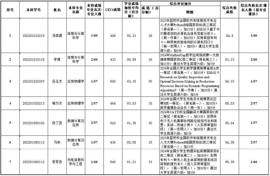 关于做好2026年推荐优秀应届本科毕业生免试攻读硕士学位研究生工作的通知》的要求,经学院广泛宣传动员,学生自愿申请,学院在完全量化的基础上,根据学校下达的推荐指标对各专业进行分配,由学院推免生工作小组审定,现决定推荐以下7名同学免试攻读硕士研究生,名单公示如下: